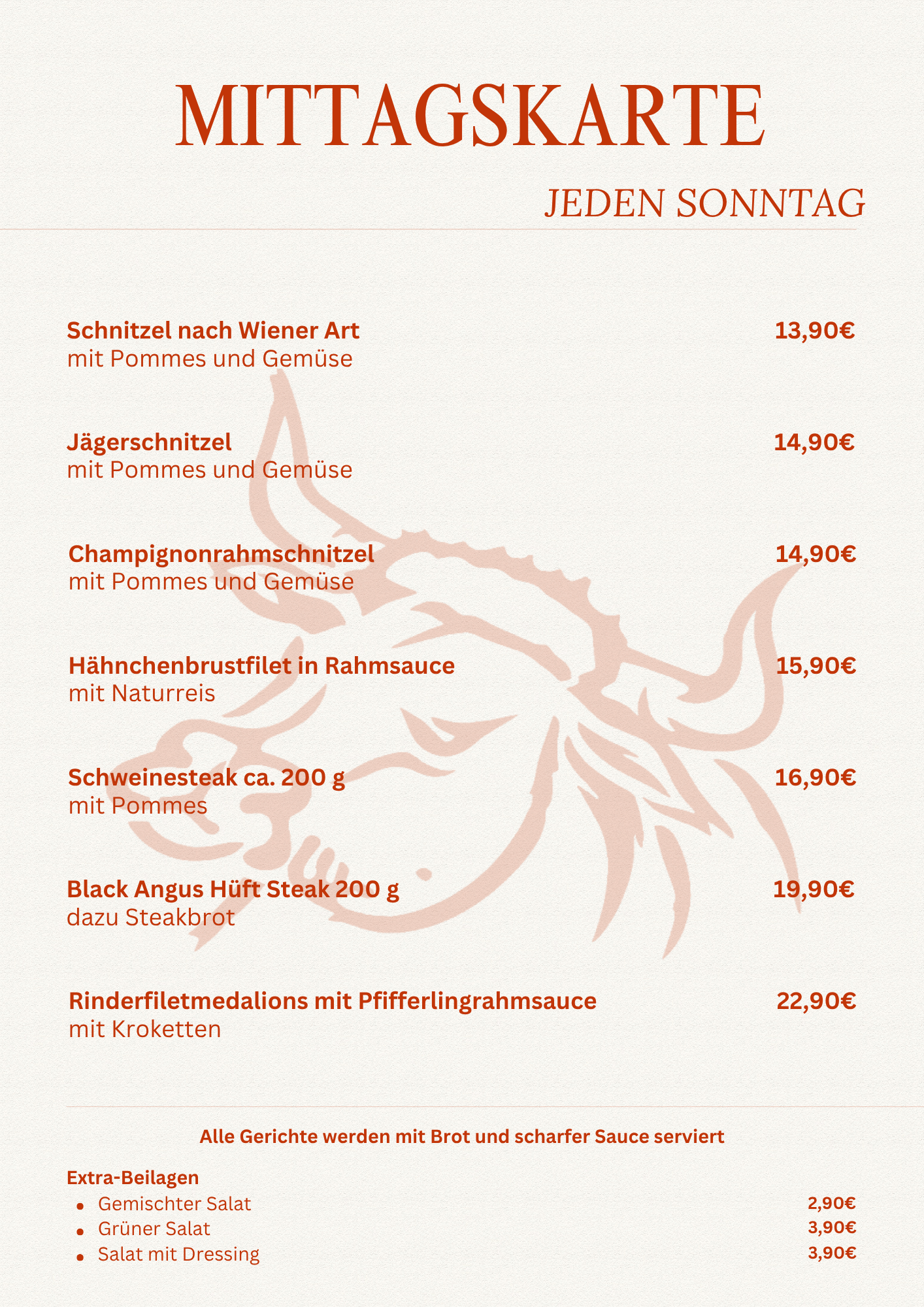 Egal ob Sie Lust auf unsere Sonntags-Specials haben oder ein Steak-Highlight aus der regulären Karte genießen möchten – wir freuen uns darauf, Sie am Sonntagmittag in Stuhr zu bewirten!